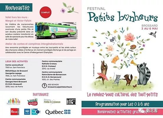 05.03-05.06 Festival Petits bonheurs,Brossard 0至6岁的宝宝节!众多免费活动,从小培养宝宝们的艺术细胞!周四上午10点至11点,周五上午10点至下午2点半,周六上午9点半至晚上8点,周天上午9点至12点15。活动不同,地点不同。
