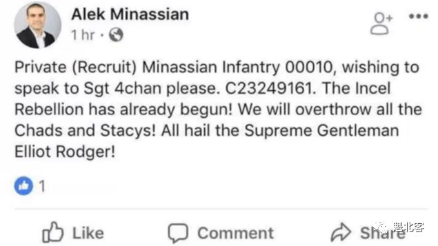 上面是嫌犯在Facebook上的帖子:“列兵(新兵)米纳希安,陆军00010,希望和4chan (一个Incel论坛) 中士交谈。…… Incel 起义已经开始!我们将打倒所有的Chads和Stacys! 向至高无上的绅士艾略特·罗杰致敬!”(脸书在得知此帖作者为撞人案嫌犯后第一时间将它删除)
