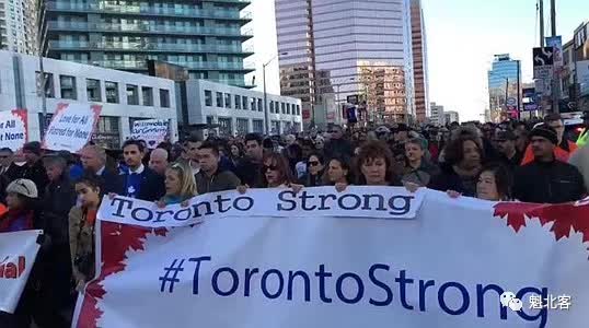 周日晚间,加拿大总理Justin Trudeau,加拿大总督Julie Payette,魁北克省长Phillipe Couillard,联邦保守党党魁Andrew Scheer和安省省长、省督、多伦多市长一众政要,同各界人士约25000人出现在多伦多Mel Lastman广场,隆重悼念汽车撞人事件中的死难者。活动主题为“坚强多伦多(Toronto Strong)”。周日下午时分起,已有数千民众汇集至撞人事发地Yonge街,人们手举着横幅,唱起挽歌,情绪倔强而气氛忧伤。23日下午1点27分,25岁的Alek Minassian开着租来的Cargo Van在北约克的Younge大街上恶意撞向行人,酿成了10死16受伤的特大悲剧。