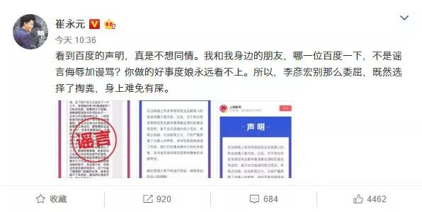 5月22日,百度公关针对“李彦宏家庭”传闻表示,百分之百的谣言,法务团队已经向公安部门报案。百度官方声明称,近日网络上有关李彦宏先生及其家人的传言纯属子虚乌有。过去,对于类似传言李彦宏先生都本着清者自清的态度没有追究,鉴于此次造谣内容之恶劣、来势之凶猛、社会影响之大,已严重损害了当事人的声誉,并对百度品牌造成了伤害,我们已收集证据向公安机关报案,坚决追究造谣者和恶意传播者的法律责任。5月23日,崔永元发文对“百度辟谣李彦宏家庭问题”的事件发表看法:看到百度的声明,真是不想同情。我和我身边的朋友,哪一位百度一下,(哪条)不是谣言侮辱加谩骂?你做的好事度娘永远看不上。所以,李彦宏别那么委屈,既然选择了掏粪,身上难免有屎。