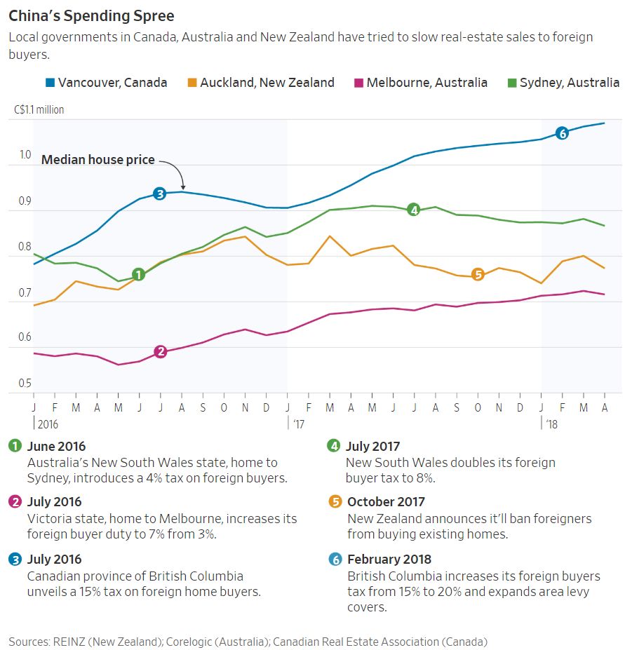 在温哥华,中国购房者疯狂买房,势头之迅猛使2016年的房价每月同比上涨30%。当地官员决定征收15%的的外国买家税,中国买主就转战多伦多,很快就把那里的房价推高。为了遏制多伦多楼市快速上涨,安大略省官员去年4月也推出15%的外国买家税。