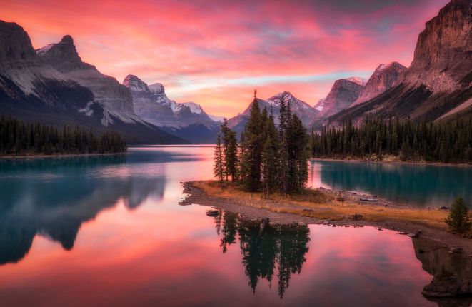 玛琳湖被评为世界上最上镜的湖泊之一。湖深处名为精灵岛(Spirit Island)的小岛是必去之处!