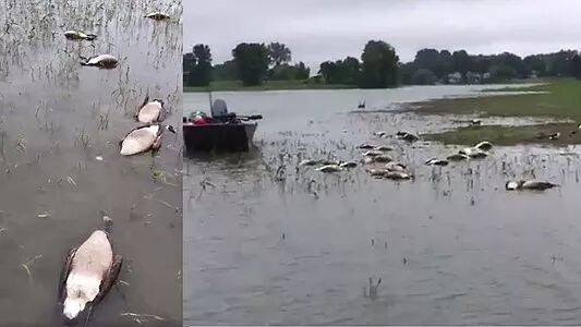 上周四,蒙特利尔东北、魁省Contrecoeur附近的一条河中发现50多只加拿大死鹅。蒙特利尔兽医专家表示,死鹅均为心脏受损,且为同时死亡。这一点排除了因污染物所致疾病或中毒相继死亡的可能。专家称,因发现尸体的地区最近有过雷电天气,所以,这些鹅可能是被雷电击中而同时死亡的。据悉,鸟类在雷电交加的空中飞行时被闪电击中、站在电线上集体触电的情况比较常见,但水面被雷电击中、再由大范围内的水面导电、同时致死许多动物、且其身上没有任何灼伤,这样的情况相当少见。专家表示,病理学家将进行进一步的测试以确认这种假设。