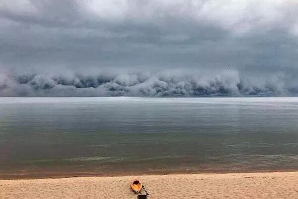 一个罕见的天气景观近日出现在美国密歇根州,被本地人Holly Belongie Marenger用相机拍了下来。Marenger表示,她与家人正在湖边散步,湖边出现了骇人一幕。阴暗的云团堆积在湖面上,仿佛是道壮观的墙,底部的云翻滚奔腾,快速向湖边袭来,像海啸,更像末日降临。而就在怪云出现的霎那,水位迅速消退,有些地方竟退了10多米。气温也从29°C速降至18°C。当时没有雨,只有狂风,狂到让人无法呼吸。气象学家解释说,这种“海啸云”属陆架云,它们常出现在超级雷暴的前方边缘。这些罕见、令人生畏的天气现象都与剧烈的冷暖气流活动有关。它们的出现往往预示着雷暴、大风、短时暴雨甚至是龙卷风之类的恶劣天气或将到来,因此,当在天空看到异象时,应及时躲到安全的地方。