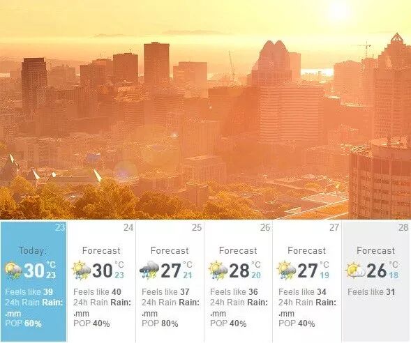 蒙特利尔本周将再次迎来高温高湿天气。加拿大环境部今日凌晨向蒙特利尔及周边地区发布高温警告称,今日南风将把美国一个潮湿气团带入魁省南部,高温高湿结合的天气将使蒙特利尔本周的体感温度接近40°C。此外,蒙特利尔自今日下午起直至周五,每天都有可能出现雷暴天气。这样的天气将对以下人群构成威胁:幼儿,孕妇,老年人,慢性病患者及从事户外工作或锻炼的人。