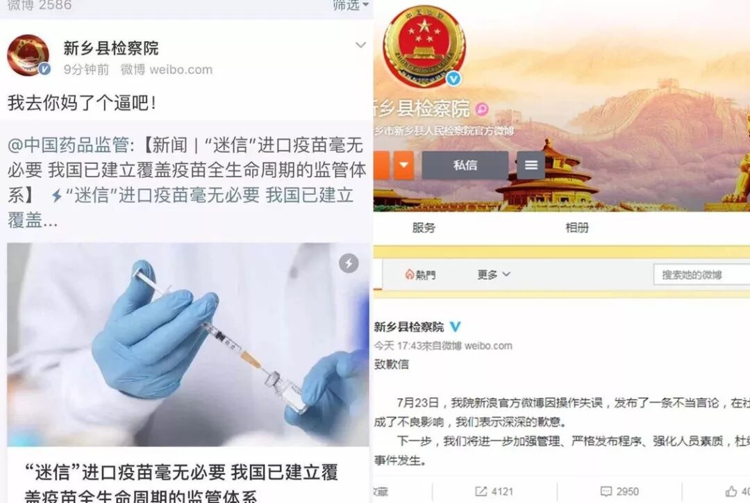 昨日,河南省新乡市新乡县人民检察院官微转发了一篇由中国国家药品监督管理局微博于6月12日转发的题为《“迷信”进口疫苗毫无必要 我国已建立覆盖疫苗全生命周期的监管体系》的旧闻。该文指,中国所有上市疫苗均将符合国家药品标准,中国疾病预防控制中心免疫规划首席专家王华庆指出,国产和进口的同种疫苗在质量标准、安全性和使用上没有明显差别。如今,疫苗造假事件曝光,为表达对此专家的无语,该检察院发出了如图般的怒吼。不久,微博被删。检察院道歉:因操作失误,发布了一条不当言论,在社会上造成了不良影响,我们表示深深的歉意……在下面的评论中,无一例外全是赞。