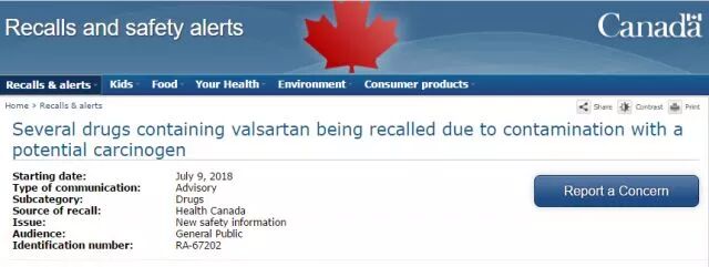 7月9日,加拿大卫生部在其官网发出通告,召回28种可能被化学物质N-二甲基亚硝胺(N-Nitrosodimethylamin)污染、有致癌的风险的降压药和心脏病药。