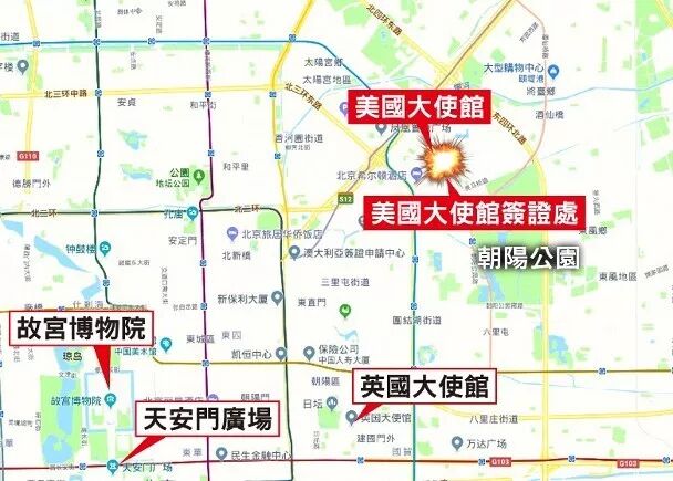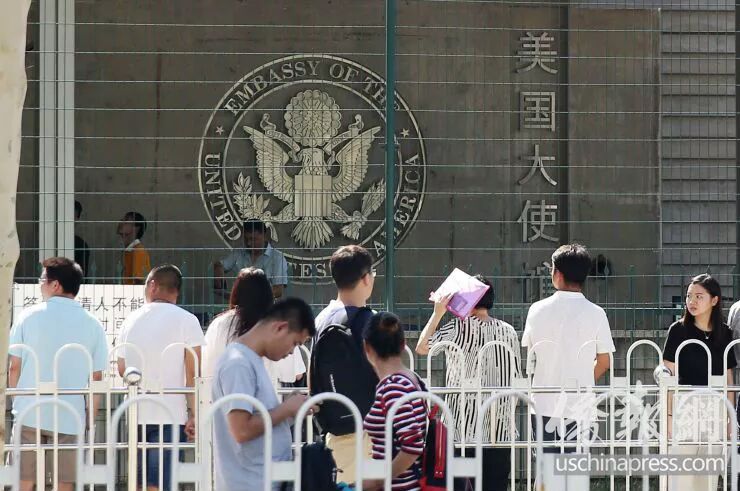 美国驻华大使馆位于北京市朝阳区安家楼路55号,据悉,每天都有上千人前往排队,办理签证。