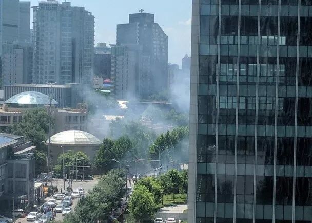 从视频内容来看,位于北京朝阳区的美国驻华大使馆南侧的天泽路上烟雾弥漫