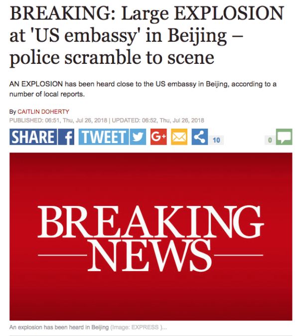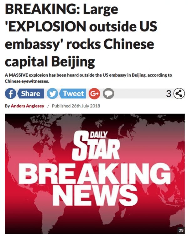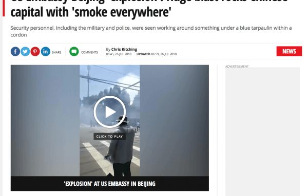 7月26日下午,有网友在微博上发布了一段视频并表示,美国驻华大使馆门口发生爆炸。