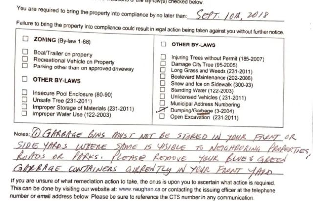 今年9月7日,家住安省约克区旺市的华裔Ron Lim,因把垃圾箱长期放置在自家的前院(车库门外)而被市政府予以警告。