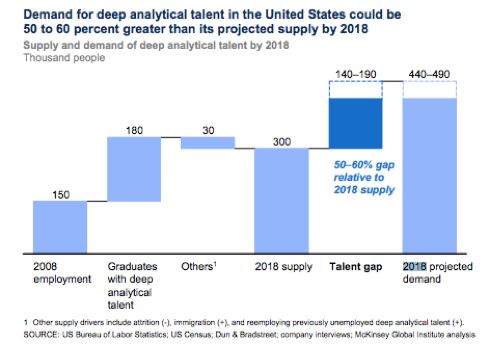 早在2011年麦肯锡就预测到,2018年对数据人才的需求量仅美国就面临14万~19万数据分析人才的空缺,以及150万能够通过大数据分析做出决策和管理的人才需求。