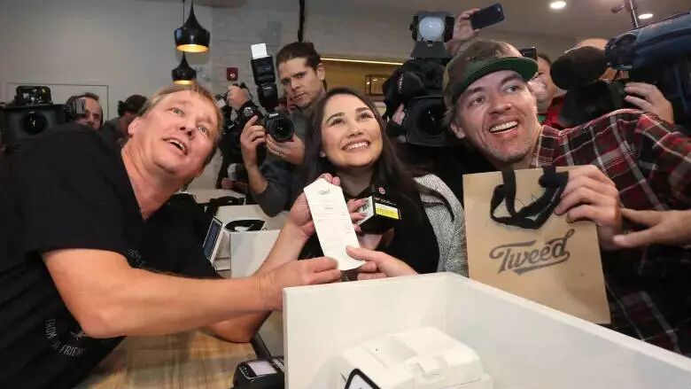 这家大麻店的母公司是安省的大麻种植生产公司Canopy Growth。该公司行政总裁布鲁斯·林顿(Bruce Linton,图左黑短袖)专程飞抵圣约翰斯市,主持大麻店的开张和第一单生意。