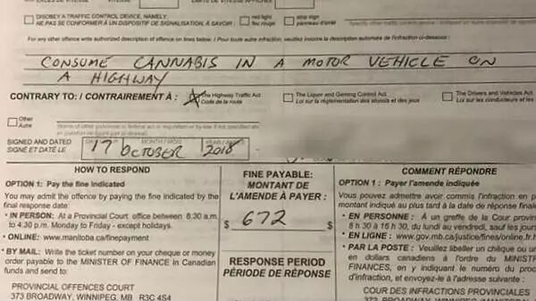 10月17日凌晨1点左右,温尼伯交警开出了加拿大大麻正式合法化后第一张违反该省有关大麻规定的交通罚单,如图:“在高速公路上的机动车中使用大麻。”违规者被处以672加元的罚款。按照温尼伯所在的曼尼托巴省规定,此为在省级公园,公共场所和车内使用大麻的罚金标准。该省还规定,若向未满19岁的人提供大麻,或在住宅内种植非药用大麻,罚金将高达2542加元。温尼伯警方在推特上贴出这张罚单并提醒说,如同饮酒,吸大麻是合法的,但亦如同饮酒,在车中发生那可就是违法的了。