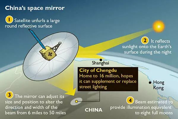 四川成都天府新区系统科学研究会近日宣称,“人造月亮”的构想有望于2022年初步实现。研究会主任武春风说,“人造月亮”其实是“携带大型空间反射镜的人造空间照明卫星”的俗称,其发射、入轨、展开、照明到调控的整体验证工作将于2020年完成。2022年,3颗“人造月亮”将在中国3大卫星发射基地选其一展开发射工作。届时,3颗“月亮”的3面巨大反射镜将等分360度轨道平面,交替运行可实现对同一地区24小时的不间断照射。真月亮距地38万公里,而“人造月亮”则预计部署在距地500公里以内的低空轨道,其反射的阳光可覆盖地表3600至6400平方公里的范围,最大光照强度预计将是现在月光的8倍。英国格拉斯哥大学航空系统工程学者Ceriotti表示,若“人造月亮”光线太强,会破坏自然界的夜循环,可能会影响到动物。哈尔滨工业大学航天学院光学所所长康为民则为“人造月亮”辩护称,“人造月亮”仅相当于黄昏的亮度,不足以颠倒生物的作息……