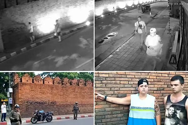 泰国警方表示,根据监控视频,加拿大女子Brittney Loretta Katherine Schneider与英国男子Furlong Lee已被捕归案,两人于上周四在泰国北部清迈府塔佩门古城墙上喷漆涂字“Scouser Lee”及“B”。警方透露,两人都是20多岁;来自利物浦的英国男子Lee承认“Scouser Lee”字样为他所涂,加拿大的Schneider则承认自己只写了个“B”字;两人现已被当局指控“破坏文物古迹”。若罪成,两人将分别面临最高10年的监禁及100万泰铢(合4万加元)的罚款,据悉,塔佩门是清迈古城所遗留下来的唯一历史遗迹,建于1296年。