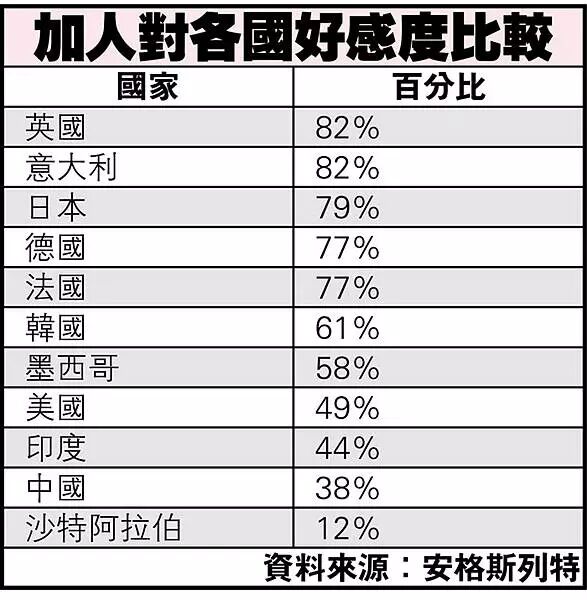 民调公司Angus Reid Institute最新调研显示,英国和意大利成为最受加拿大人青睐的国家,分获82%加拿大受访者的正面赞赏。由于美国政府于近年的贸易谈判中不断欺辱加拿大领导层,加拿大人对美国的好感度已骤降为49%。而对于美墨加协定的另一签署国墨西哥,则获得了加拿大人58%的好评,比2016年猛增了7个百分点。此外,加拿大受访者对中国的好感度仅为38%,远低于同属亚洲的日本(79%)和韩国(61%),更低于中国人从来都看不太上的印度(44%)。由于外交风波,目前只有12%的加拿大人对沙特存在好感。值得一提的是,18至34岁的加拿大人认为沙特是“积极的”,其数量是55岁及以上加拿大受访者的两倍。