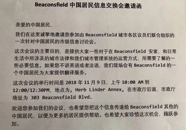 Beaconsfield市政府向华人示好 11.09 蒙特利尔西岛Beaconsfield市政府安排了一次针对中国居民的信息交流会,为大家提供有关在Beaconsfield安家、生活所需要了解的必要信息。现场有中文翻译讲解!不用担心听不懂!Beaconsfield的华人居民有空都去参加!当然,也同样欢迎相邻的Baie d’urfe,甚至其他社区、今后想搬到这里的朋友们,一起来听!10点至12点/12点半;303 beaconsfield blvd,市政厅后面 Herb Annex 魁北客前文:Beaconsfield市政府突然向华人大撒中文邀请函!
