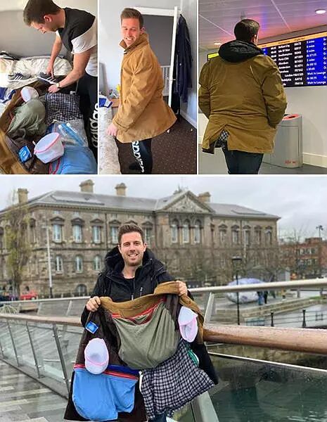 为避免托运行李增加飞行支出,英国小伙Lee Cimino突发奇想,在一件大衣的里面缝上大小不一的口袋,把“行李”全都“穿”在了身上……长裤、短裤、内裤、袜子、T恤衫、针织衫、洗漱用品、毛巾还有一双鞋。Cimino说,原本廉价航空会提供给乘客一定额度的免费手提行李,但他所常搭的瑞安航空(欧洲最大廉航)最近取消了这项福利。“我不得已而为之,但这么做并未违反航空公司的规定。”Cimino表示,穿着这件大衣出行挺舒服哒,从曼彻斯特登机,飞抵北爱尔兰,一路畅通无阻。Cimino还将全程拍成视频上传脸书,其省钱妙招赢得了网友赞许。其实此举并非首创,之前曾有旅客为避免行李超重而身穿15条内裤、3件大毛衣、两件厚外套成功通关。没人笑话他胖,但见其当时“汗如雨下、气喘如牛”……人们开始担心:他的病,会不会传染?