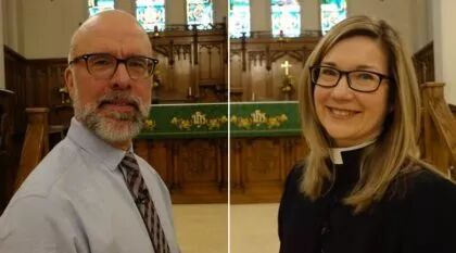 加拿大“全国信托基金”慈善组织主管Robert Pajot到渥太华市西区的的圣公会教堂与女牧师Victoria Scott商议保护教堂的办法 (Max Paris/CBC News)