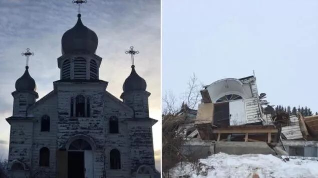 萨省一个小镇2018年拆除了一个已不安全的教堂(Pauline Bear/CBC)
