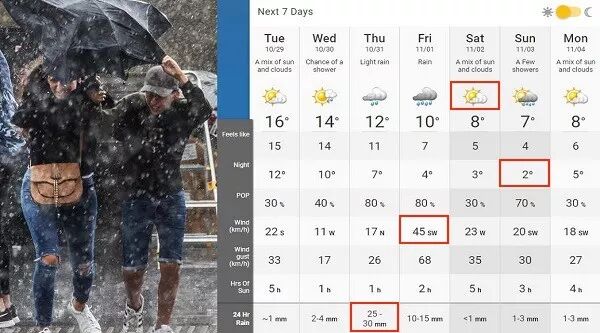 来自五大湖的一个低压天气系统将在本周末影响魁省。该系统将带来大雨和强风。自今日开始,阳光变得稀少,湿度增加,周日夜间的温度将只有零上2℃。此期间总降雨量可能会超过50毫米,区域性最高风力可能会高达每小时90公里。大雨可能会引发洪水及路面积水,请收起、或固定好任何可能被大风吹动的户外用品。据天气预报网站显示,周四雨最大,周五风最强,周日最冷……唯有周六幸存,适合安装雪棚,或聚餐。