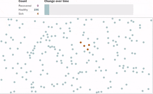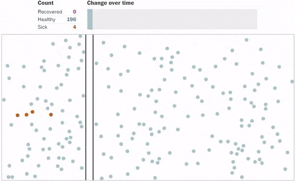 我们上面看到的4个推演图(【图形4】【图形5】【图形6】【图形7】),显示了4种随机状态:自由放任、尝试隔离、适度社交距离和延展性社交距离。基于是随机状态,您阅读本文时,每个模拟的结果都不一样。如果您稍后回到文章顶部,重新启动模拟或您稍后再返回此页面,得到的模拟结果都是不一样的。