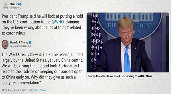 会后,特朗普继续发推表示,“世卫组织确实搞砸了。基于某些原因,WHO的资金主要来自美国,可他们却把中国视作重点。我们得好好‘琢磨琢磨’。幸运的是,我当初拒绝了他们要求我们保持对中国开放边境的建议。可为什么他们给我们的建议如此错误?