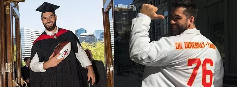 身披76号战袍效力于美国堪萨斯城酋长队的魁北克橄榄球明星,Laurent Duvernay-Tardif,2018年5月获麦吉尔大学医学博士学位。现年29岁的他生于魁省Mont-Saint-Hilaire市,19岁成为麦吉尔大学Redmen橄榄球队球员,2014年NFL选秀第六轮被堪萨斯城酋长队选中。他一直边打球边攻读医学博士学位,这期间他不嫌奔波,但逢球队休假,便会飞回蒙特利尔继续学习。