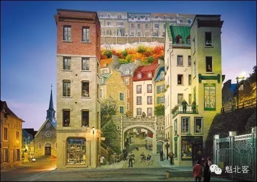 在魁北克城著名的立体壁画共计有6处,下面这一个主题为“魁北克人”的壁画是最大、最著名的,它断断续续从1999年到2008年才全部完成,规模和立体效果令人叹为观止。画中有15位以上是在魁北克历史中的真实人物。