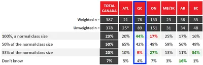 此外,44%的魁省受调者“可以接受正常的班级人数”,而安省这样认为的只有17%,加拿大全国数据为23%。