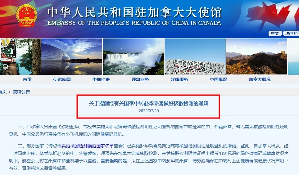 加拿大不在此次的名单中,这就意味着,目前从加拿大直飞中国,仍无需提供新冠核酸检测证明(留学生包机仍需要提供),但若经由以上7个国家中转(生效日起),则必须提供阴性证明才能登机!