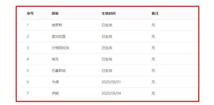 截止目前,赴华实施核酸检测措施的国家有以下7个: