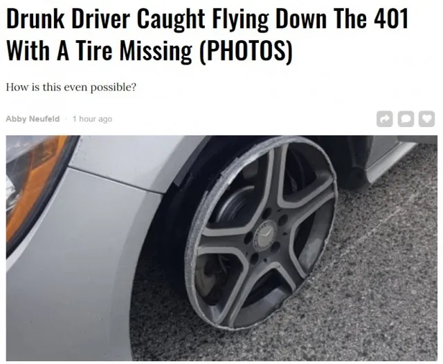 加拿大安省省警给出了一个典型答案:一个司机在当地401高速酒后驾车,一只轮胎没了都不知道,仅剩下轮毂依旧狂奔,所幸被警察及时拦下,否则不知后果会多严重。