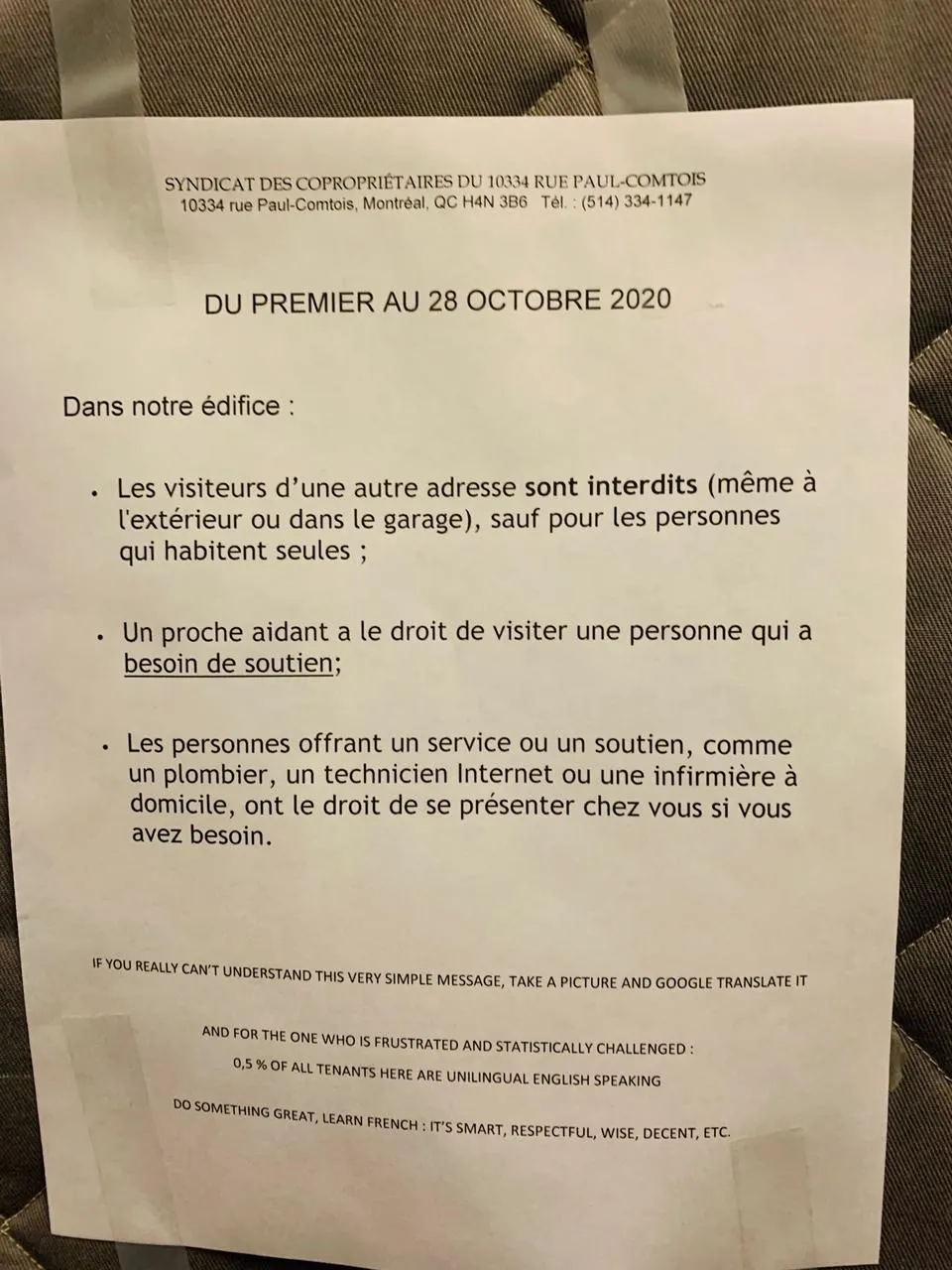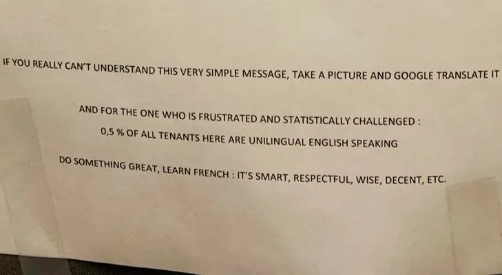 不仅如此,通知下面还写道:这里只有0.5%的租户说英语。做点有意义的事,学习法语:这很聪明、恭敬、明智和体面,等等。