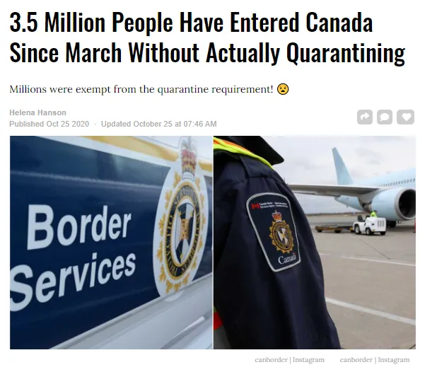 加拿大是今年3月21起实施旅行限制的,自实施以来至今已有7个月的时间,大约有375万人并未进行14天的隔离。