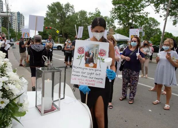 2020年7月23日 蒙特利尔 人们在一处老年公寓前悼念/加通社