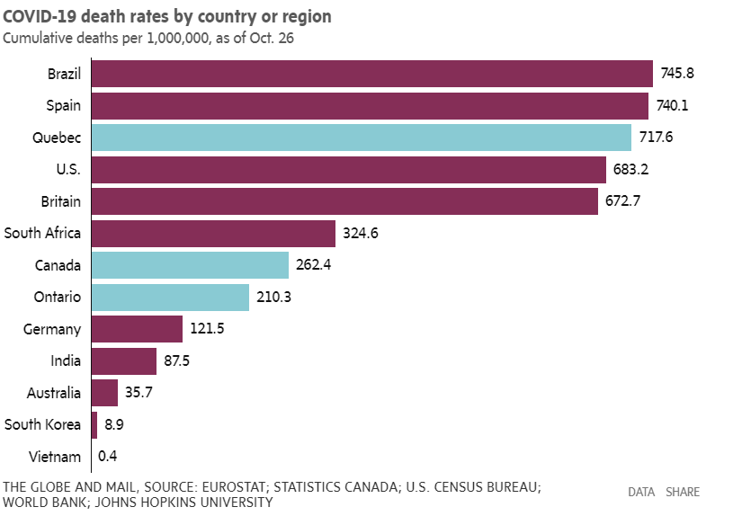 全加拿大COVID-19死亡率为每百万262人。这是德国的两倍,大约是美国的三分之一。