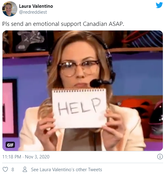 加拿大网友@Mark Piper说:“美国朋友们,如果你需要一个治愈系加拿大人,那么我可以。我收获了一些粮食,现在正在喝点黑麦威士忌,所以我可以倾听。我在这里等你们。”这条推特被点赞超过5000次。(小编怎么觉得这个有点儿气人呢,那边伤心欲绝,这边悠悠闲喝威士忌…)