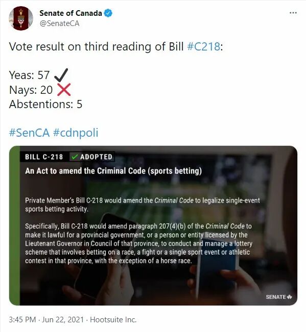 参议院在以57票赞同,20票反对,5票弃权通过后,正式通过C-218法案。这意味着加拿大《刑法》将被修改,以允许对田径,格斗,球类等单一体育赛事进行投注,但“赛马”除外。