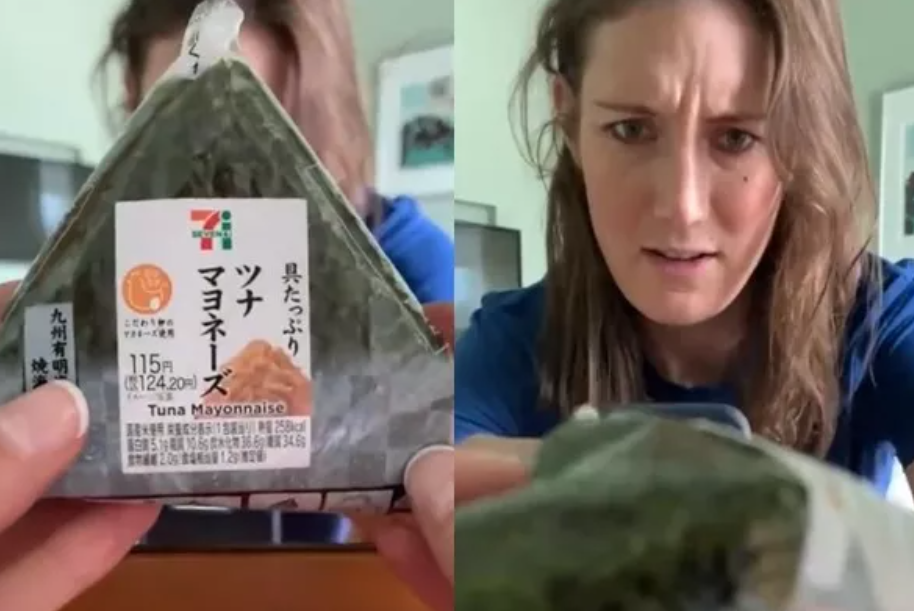 在视频中,只见Bucsis不停地摆弄着一个鲔鱼御饭团,为了拆开包装足足与之奋斗了32秒。她一边拿着饭团一边表示,从7-11买来的这种价格约1美金的饭团是自己在日本最爱的食物。但头疼的是,她实在不知道该如何正确打开饭团的外包装。