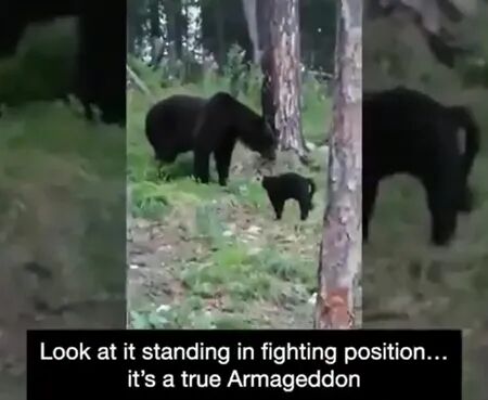 只见黑猫瓦莎——相当霸气地挡在身材数十倍于它的棕熊面前,弓起后背,勾起尾巴,低声嘶吼,随时准备一跃而起,发动攻击。