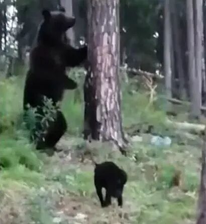 棕熊试探性地向前移几步,围着树转一圈,并不时做出攻击前的跃起动作……但瓦莎以不变应万变,毫不退缩,死盯棕熊。