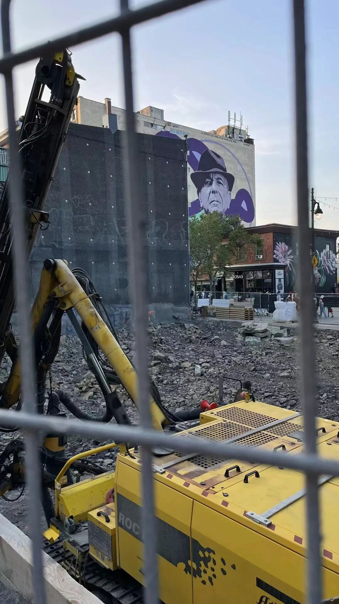 当小编在小巷里穿行,一处工地的远方,突然出现了蒙特利尔人文标志之一、艺术大师科恩的肖像壁画。