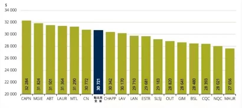 值得注意的是,在同一行政区,收入也可能存在巨大差异。譬如,在北岸区(Côte-Nord),一个主营矿产开发的市政联合体的人均可支配收入最高可达$43,044 加元;而另一个没有矿产开发的市政联合体,人均可支配收入就只有$28,343加元。