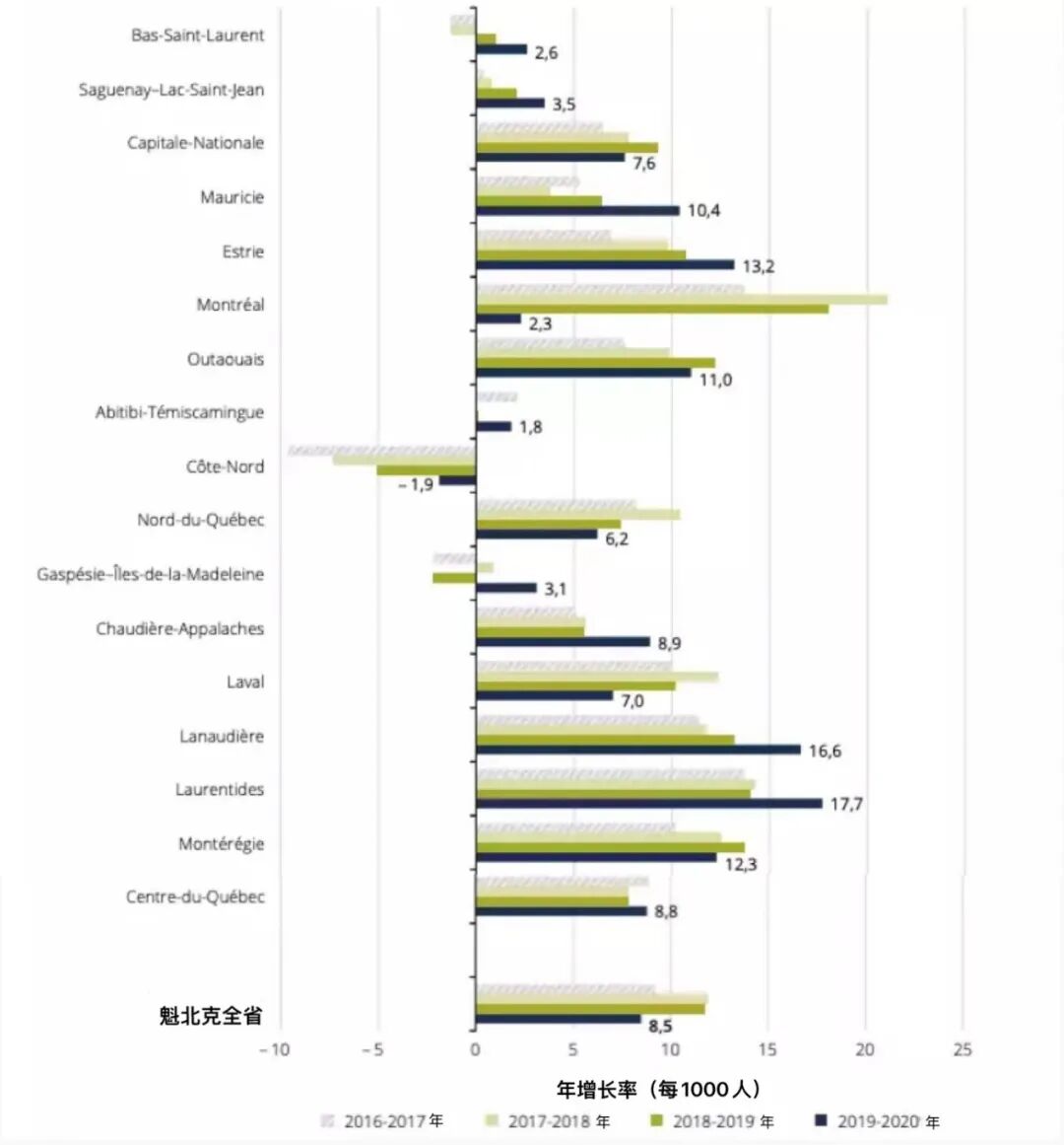 17个行政区中,只有北岸区(Côte-Nord)一直处于人口负增长状态,但2019-2020年度的降速小于往年。