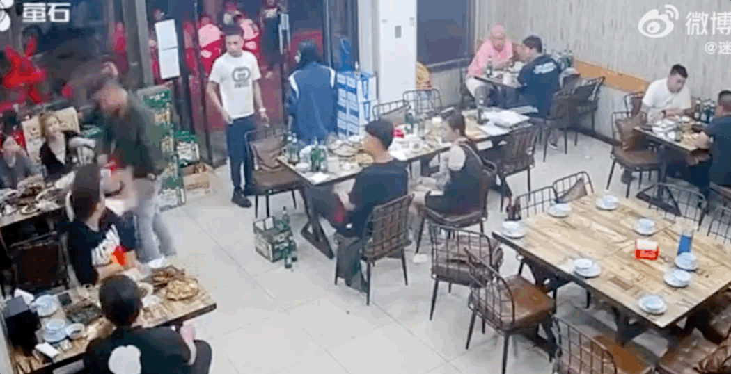 事情发生在北京时间6月10日凌晨的唐山一家烧烤店内,靠近门口坐着一桌女生,三人穿着简单的T恤或者长袖,正在边吃边聊。突然,一个身穿绿色上衣浅灰紧身牛仔裤的男子靠近三人,直接上手摸了白T恤女子的后背。