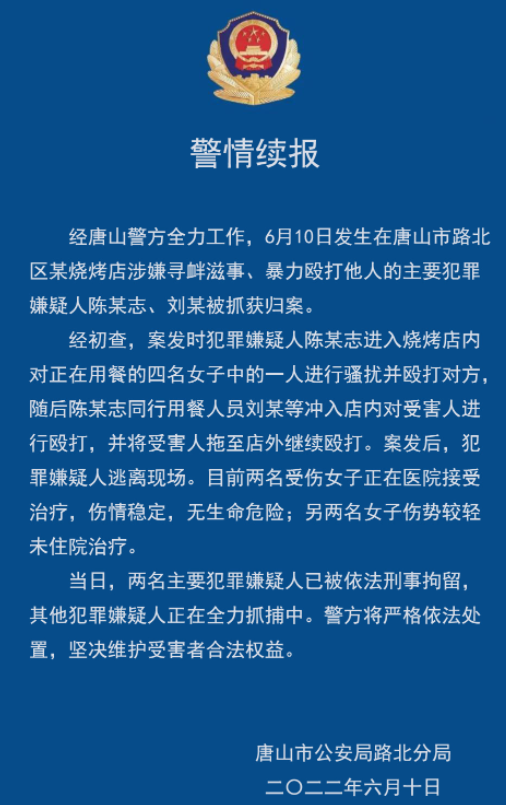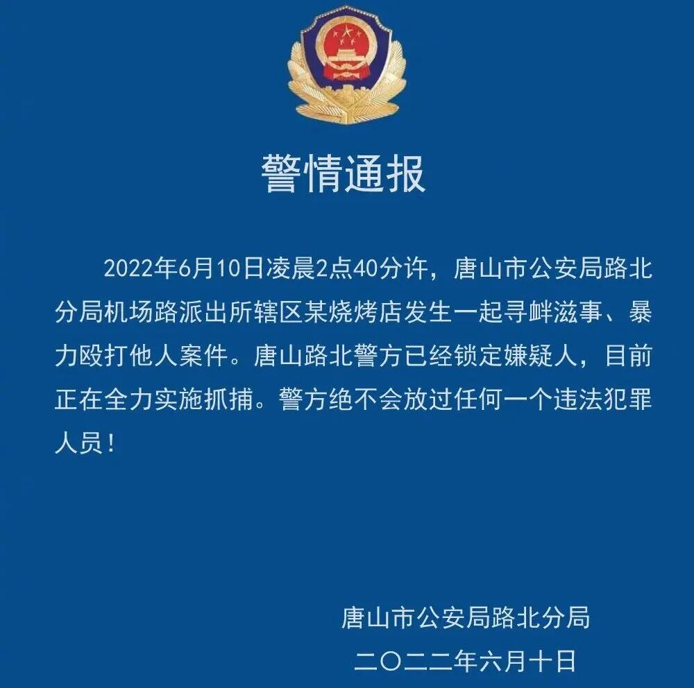事情发生在北京时间6月10日的夜晚,唐山警察局于北京时间下午5点钟发布通报,称正在全力实施抓捕。