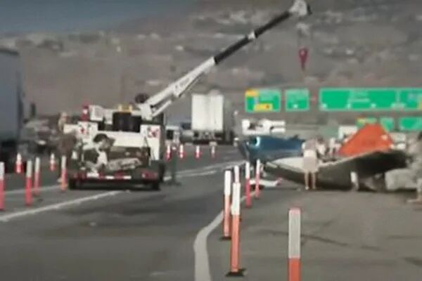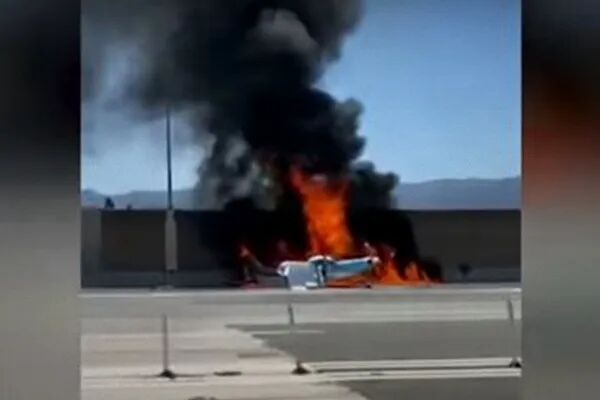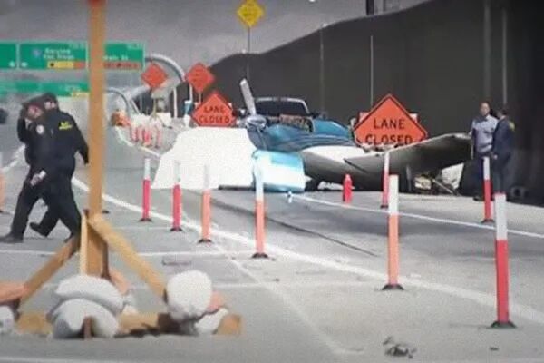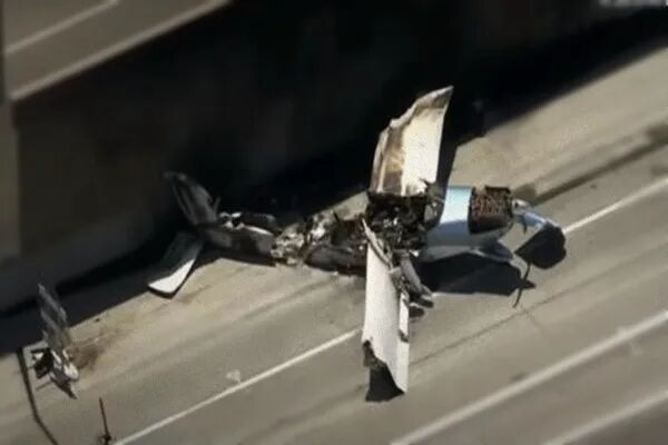 昨日中午,一架小型飞机在南加州河滨县91号高速公路东向车道上迫降时,翅膀刮到隔离护栏,导致飞机侧滑、翻倒,继而撞墙、起火。
