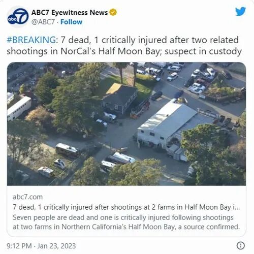 据NBC编译报道,加州圣马特奥县(San Mateo County)治安官办公室表示,周一下午,位于北加州湾区半月湾(Half Moon Bay)的两个农场连续发生两起枪击案,7人被杀,1人重伤危殆。